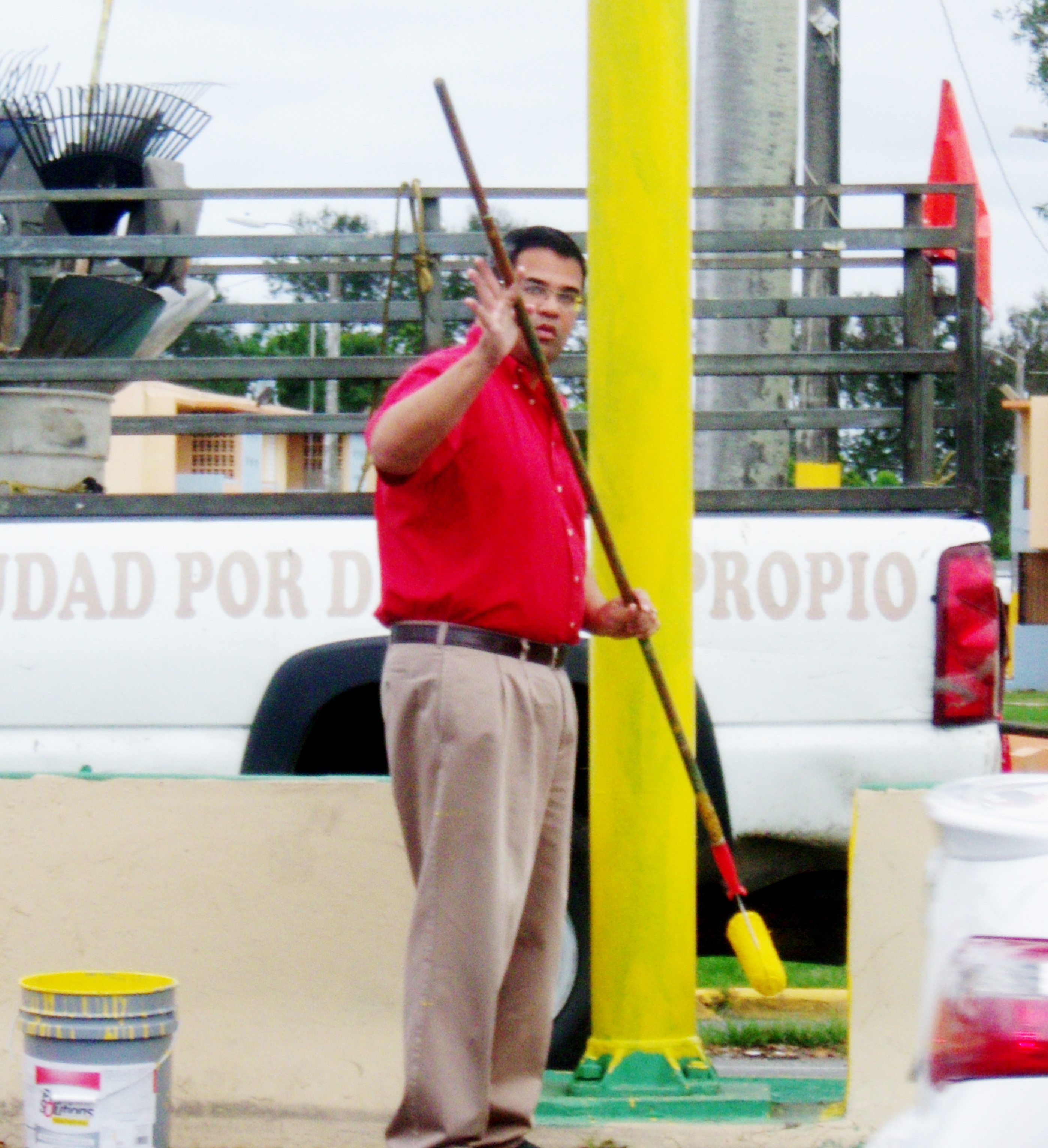 El alcalde Marcos Cruz Molina estaba esta mañana dándole una manita a los empleados municipales que trabajan en la brigada que da mantenimiento a la Carretera Dos y lo soprendimos pintando, con los colores de nuestra ciudad.