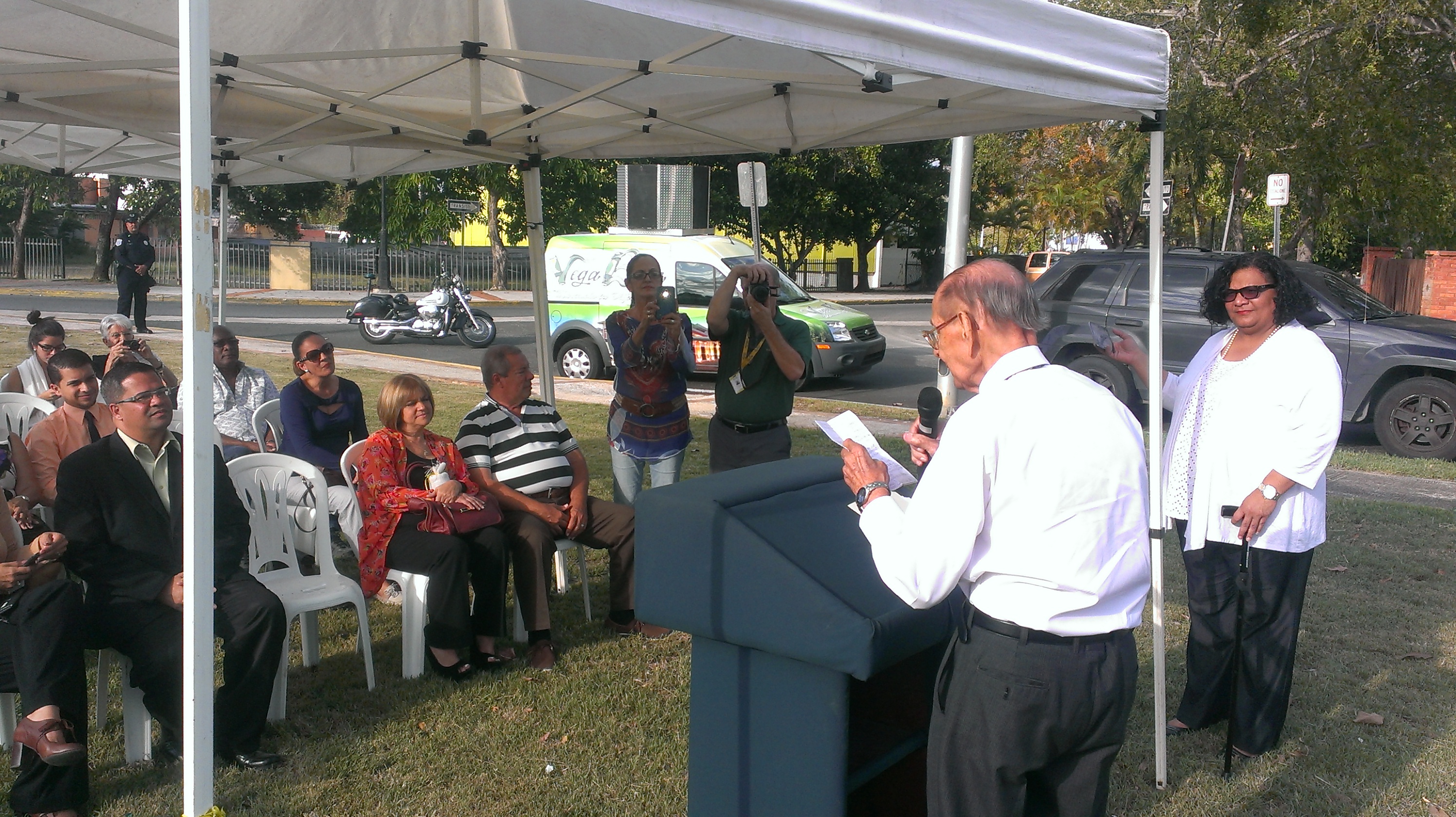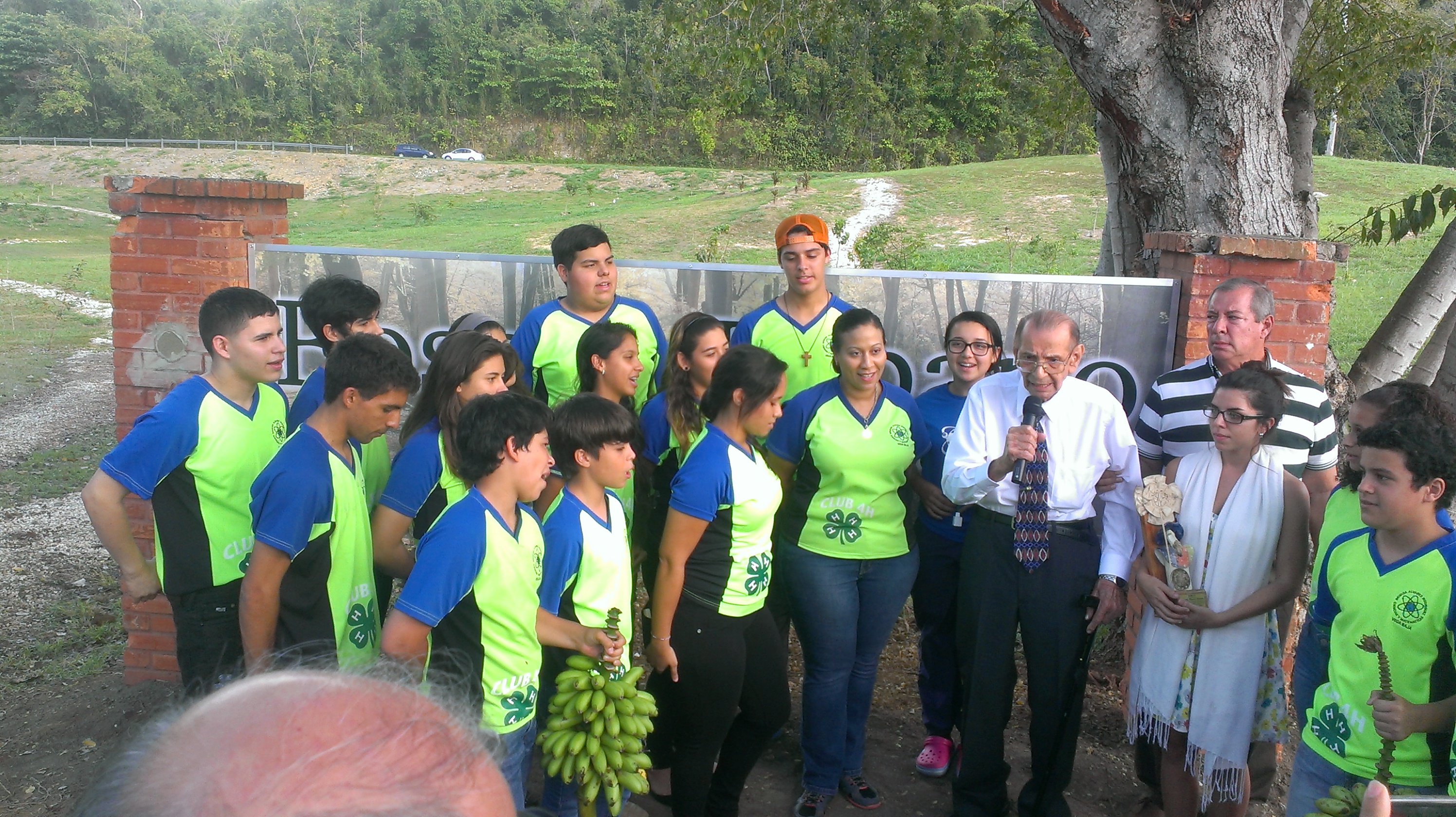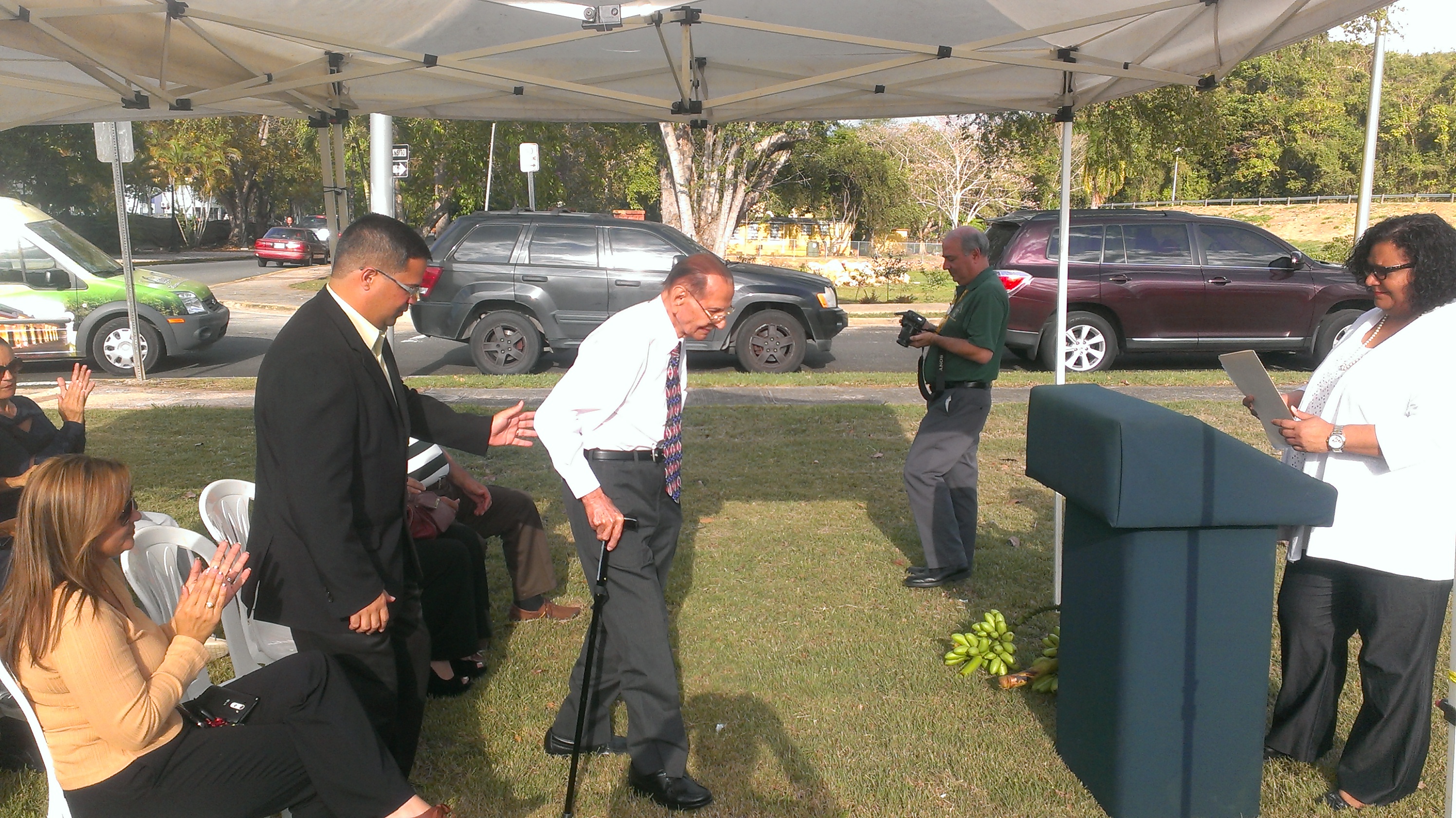 El alcalde Marcos Cruz Molina acompaña a Don Roberto al podio. A la derecha, le espera la Maestra de Ceremonias Ana Avilés y sobre la grama, un ramo de guineos producido en el Bosque Urbano.