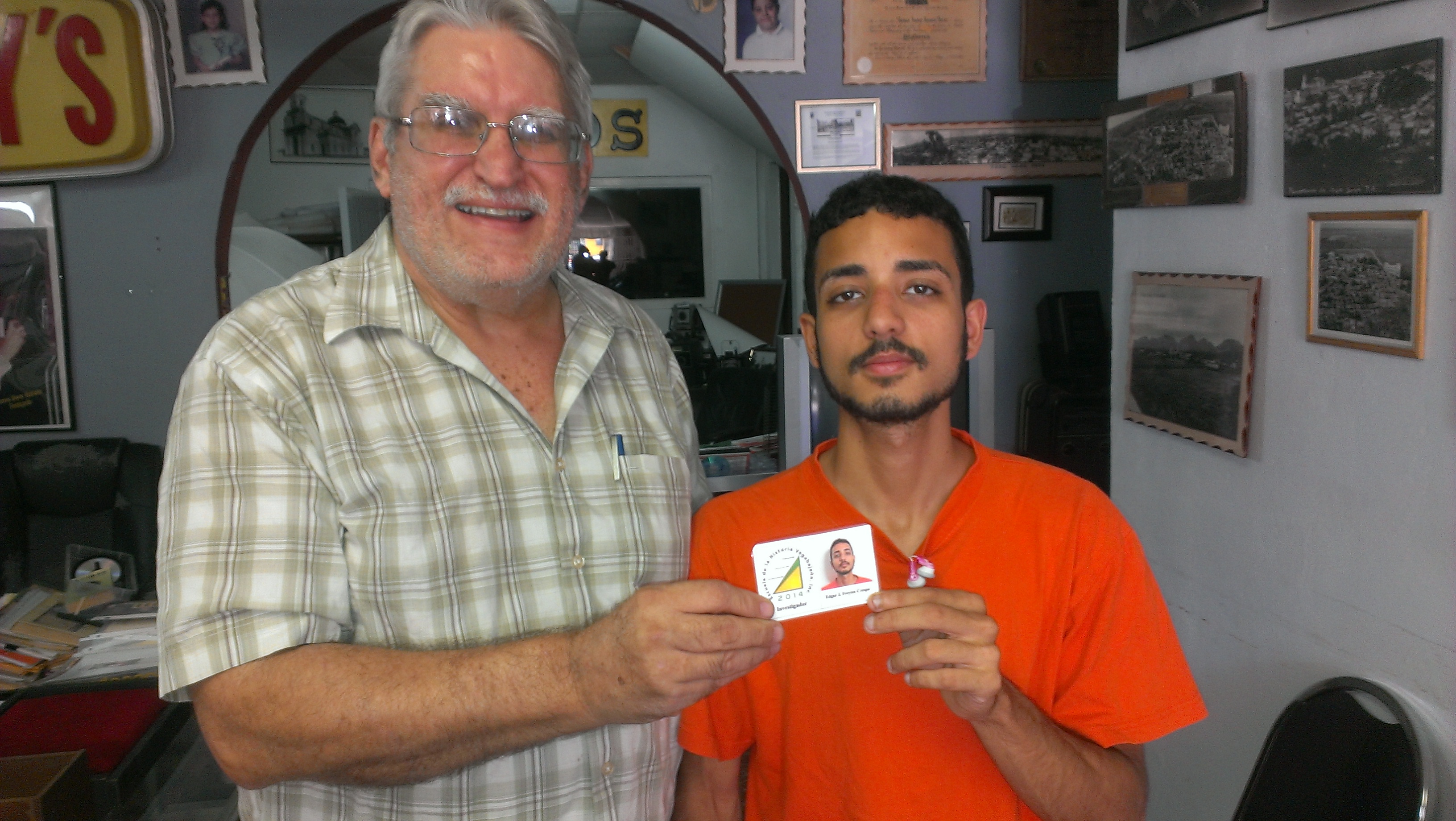 El primero en recibir su credencial como Investigador de la Escuela de la Historia Vegabajeña fue Gaston Berthinet Jiménez, un descendiente de una de las familias de agricultores vegabajeños de gran presencia en la historia de nuestra ciudad quien se ha dedicado a investigar y difundir sus conocimientos y a aprender sobre nuestro pasado colectivo.José Luis Maldonado Quirindongo (Luigi) es un jóven vegabajeño que con su bien carácter y dedicación desinteresada mediante el arte de la fotografía ha estado aportando a la historia vegabajeña. Es sumamente curioso y determinado a buscar la verdad y a disfrutarla.Rolando Rivera Garratón ha compartido la vida de nuestra ciudad como estudiante, músico, servidor público y en la política, entre otras actividades humanas. Siempre ha tenido la vocación del estudio de la historia y el rescate de la misma. En su retiro está dedicando tiempo a estudiar la historia local e incluso a producirla.Edgar Freytes es el más joven de los persistentes y continuos asistentes a las sesiones de la Escuela de la Historia Vegabajeña. Es también un ansioso investigador nato, que busca continuamente los lugares, objetos y la naturaleza. La graba en sus fotos y las recrea con efectos maravillosos, dándole una dimensión especial a su trabajo histórico.Juan Carlos Rosario es un educador profesional, como otros miembros de la Escuela de la Historia Vegabajeña. Tiene mucho conocimiento de la arqueología y la historia en general de Vega Baja porque ha sido investigador desde su juventud. Es una figura constante de la Escuela, con sus aportaciones de conocimiento y opiniones bien fundamentadas de los eventos de nuestro pasado.